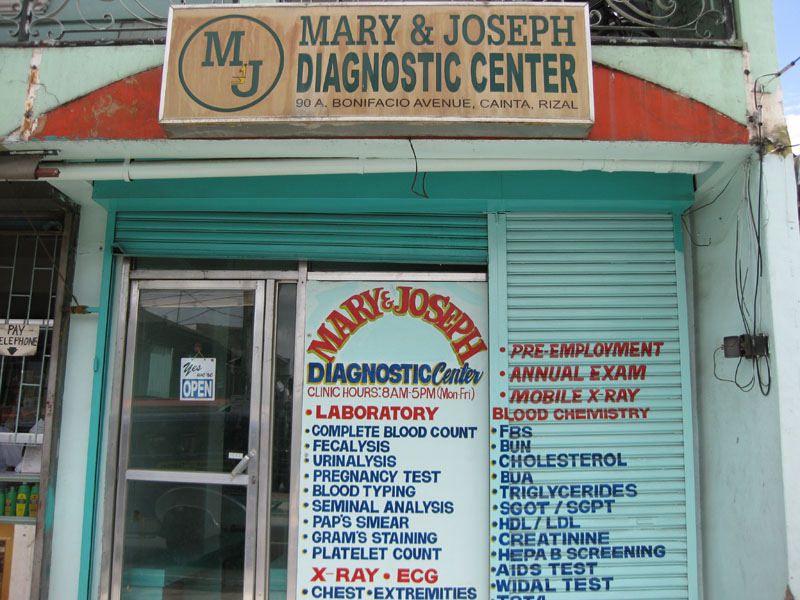 | | Mary and Joseph Diagnostic Center 90 A. Bonifacio Street, Cainta, Rizal Telephone: 6647086 | |